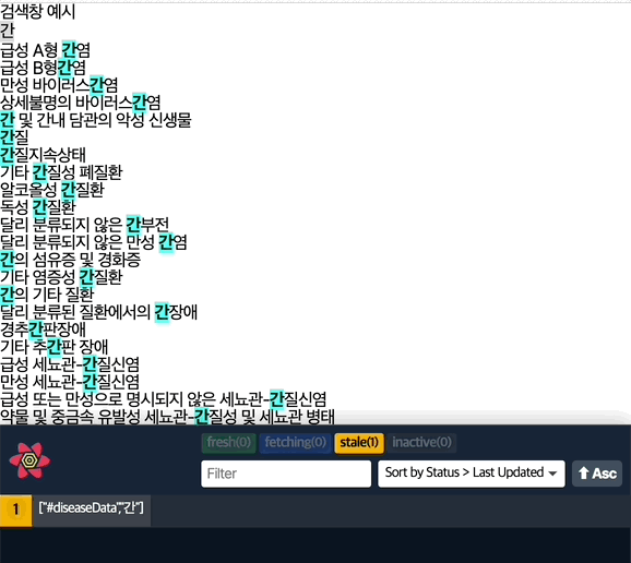 searchText가‘간’이라는 문자열일 경우, 이 때 요청된 쿼리는‘diseaseData’와‘간’이라는 두 개의 식별자를 가지며, 이후에searchText가 다시 한번‘간’이라는 값을 가질 때 재요청을 할 지, 같은 식별자를 가진 쿼리 캐시를 가져올지 판단한다