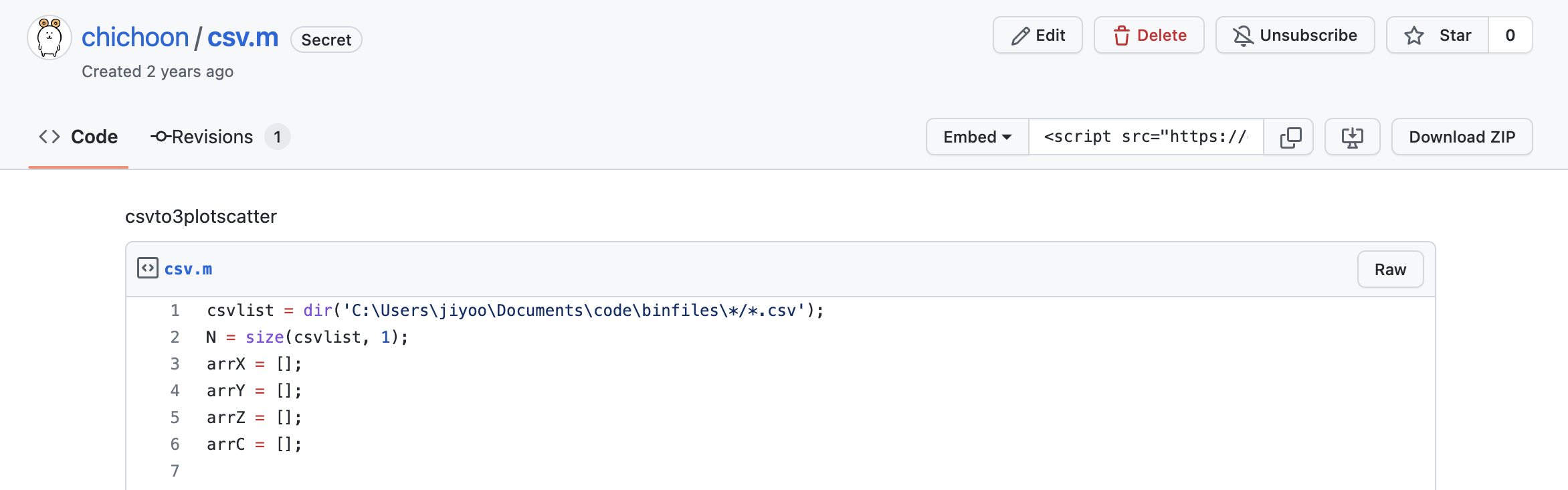 Edit으로 전체 코드를 수정할 수 있다 (Gist 생성 시와 같은 창이 나온다)Delete로 Gist 전체를 삭제할 수 있다Revisions에는 해당 Gist에 올라온 모든 커밋을 볼 수 있다… 만 커밋 메시지는 출력되지 않으니 참고하자Embed옆의 링크를 복사하여 웹에 붙여넣으면 임베드 코드 조각이 생성된다Download ZIP버튼을 눌러 전체 소스코드 다운로드도 가능하다