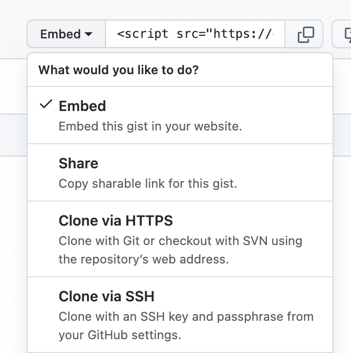 Embed는 말 그대로 임베드 링크를 제공하며, 웹사이트 등에 입력하면 해당 위치에 코드 블럭이 생성된다Share는 단순 링크를 제공하며, 브라우저 상단에 출력되는 링크와 같다Clone via HTTPS와Clone via SSH는 로컬에 Gist를 클론받을 때 사용하면 된다 (클론 방법은 Github repo와 같다)