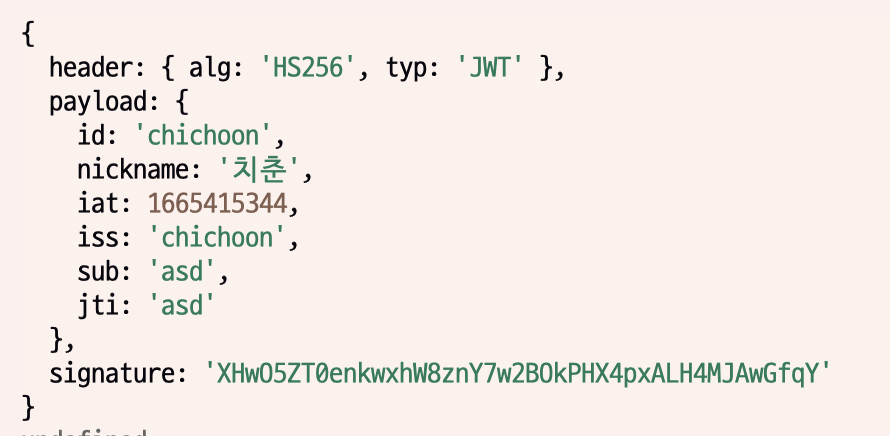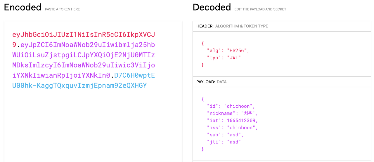 위에 내가 설정한 값 (id, nickname, iss, sub, jti) 과 동일하게 잘 들어간 것을 확인할 수 있다