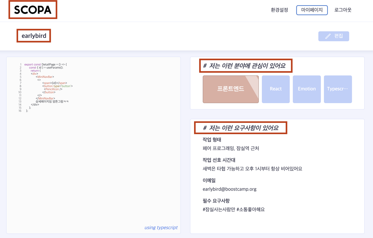 위의 예시에서 SCOPA (이 프로젝트의 이름 = 웹 사이트의 이름) 는 h1, 유저의 닉네임 (earlybird) 은 h2, 해당 유저의 프로필 관련 요소 제목 (# 저는 이런 분야에~, # 저는 이런 요구사항이~) 은 h3으로 표현하였다