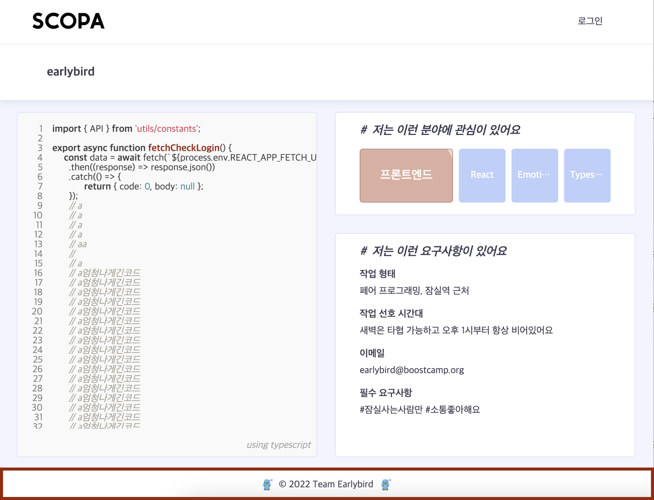 <p>SCOPA는 코드를 통해 소통하고 팀원을 구할 수 있는 웹 서비스이다</p>
