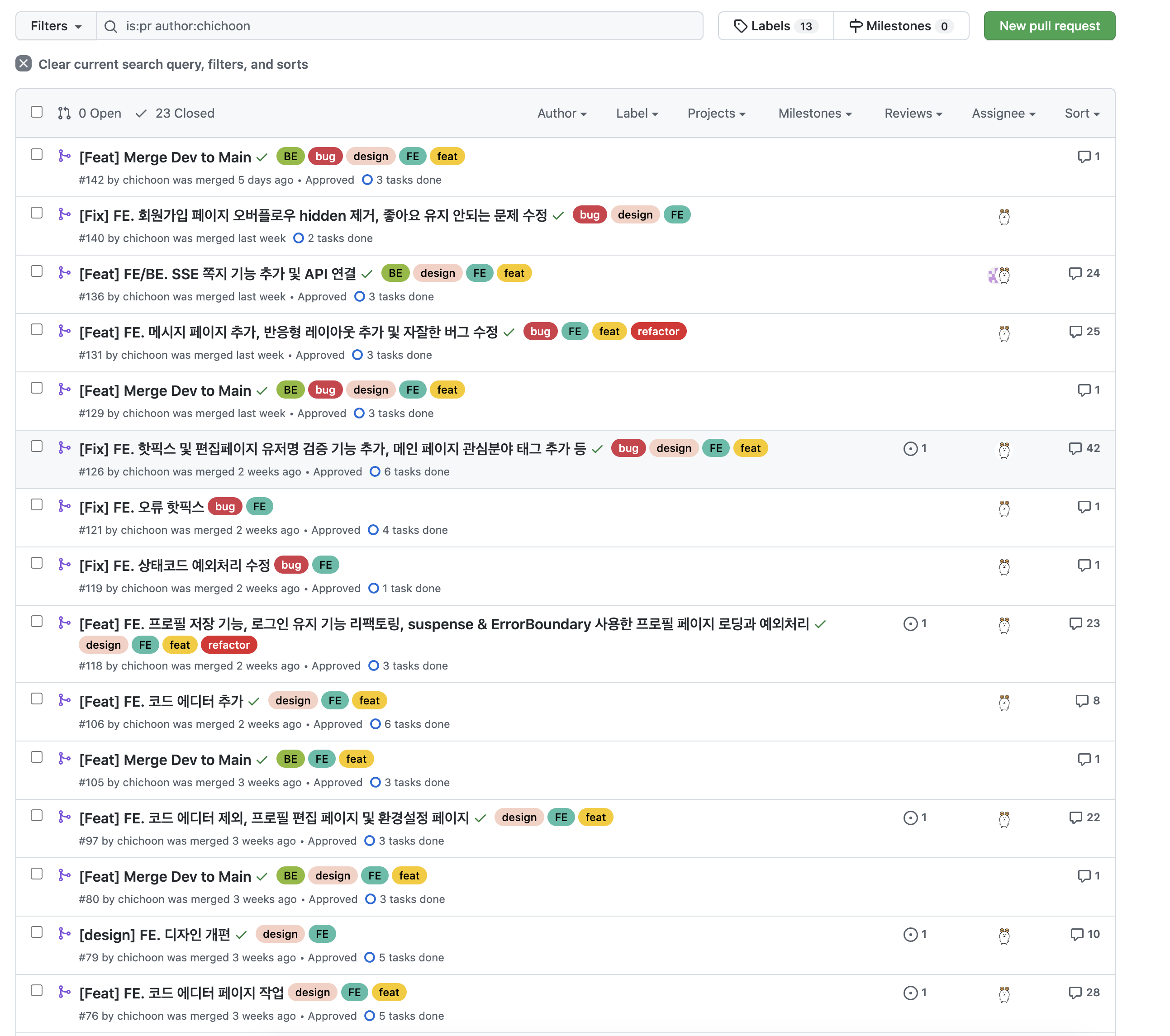 정말... 많은... 내가올린 PR 기록들............... 최근 PR로 갈 수록 버그 태그가 눈에 띈다