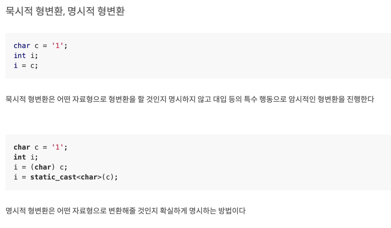 요약하자면 묵시적 형변환이란? 이런 타입으로 형변환을 하겠다~~ 라고 명시하지 않았는데 컴파일러가 코드를 읽고 음 이렇게 변환하면 되겠군 하고 임의로 판단하여 (묵시적으로) 형변환을 하는 경우이다