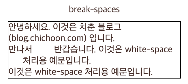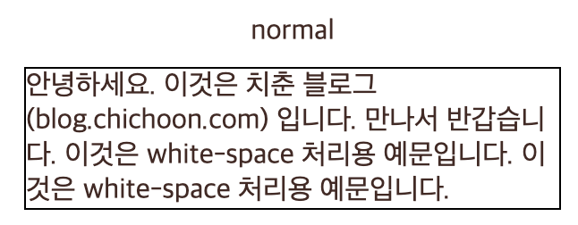 '안녕하세요. 이것은 치춘 블로그 (blog.chichoon.com) 입니다.\n만나서         반갑습니다. 이것은 white-space 처리용 예문입니다.\n이것은 white-space 처리용 예문입니다.'