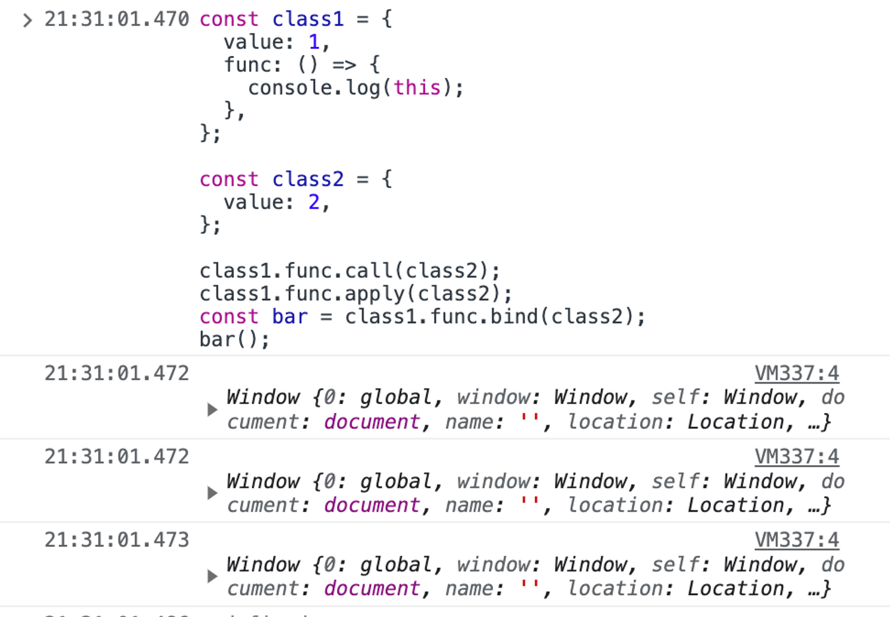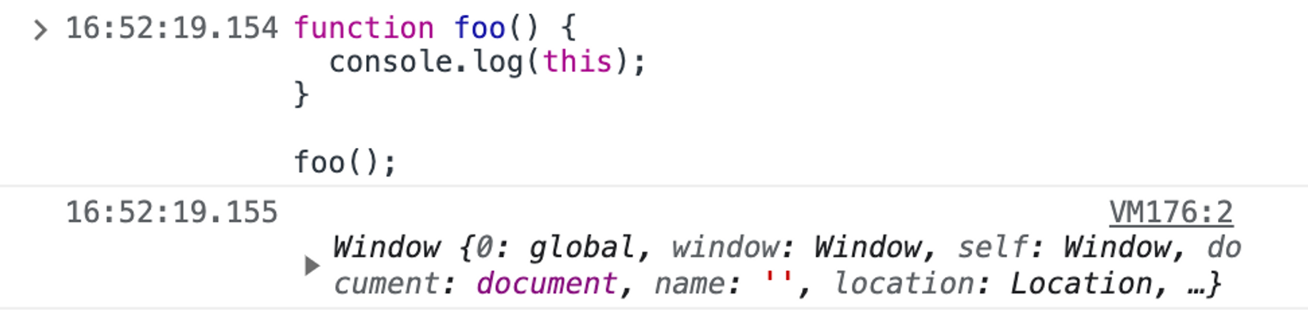 단순 호출 시에는 호출된 시점에서의 부모 객체를 참조하므로, 위에서 foo가 호출되었을 때의 부모 객체인 Window (또는 global) 객체가 출력된다